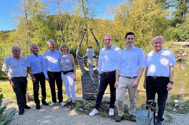 Die eigens geschaffene Skulptur wurde mit dem feierlichen Jubiläumsakt eingeweiht. Auf dem Bild von links nach rechts: Oski Umbricht (Administrator), Richi Keller (OK-Präsident), Kurt und Franziska Schmid, Ralph Werder (Gemeindeammann), Benjamin Giezendanner (NR und AGV-Präsident) und René Ammann (Vereinspräsident).